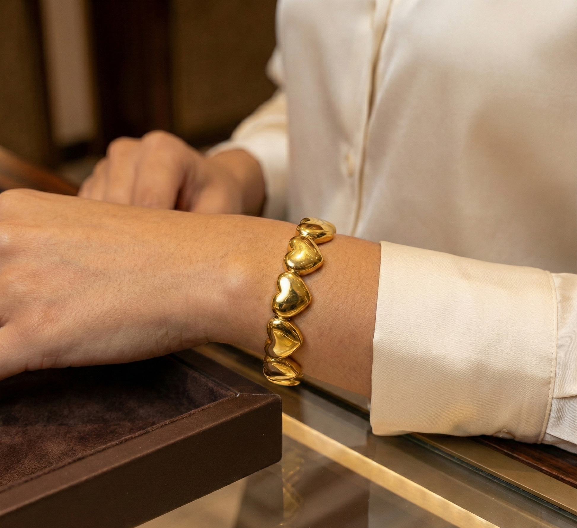 Celebra el amor y la elegancia atemporal con este impresionante brazalete. Su diseño se compone de una serie de corazones tridimensionales y redondeados, unidos entre sí para formar una pieza fluida y cómoda que envuelve la muñeca con gracia.