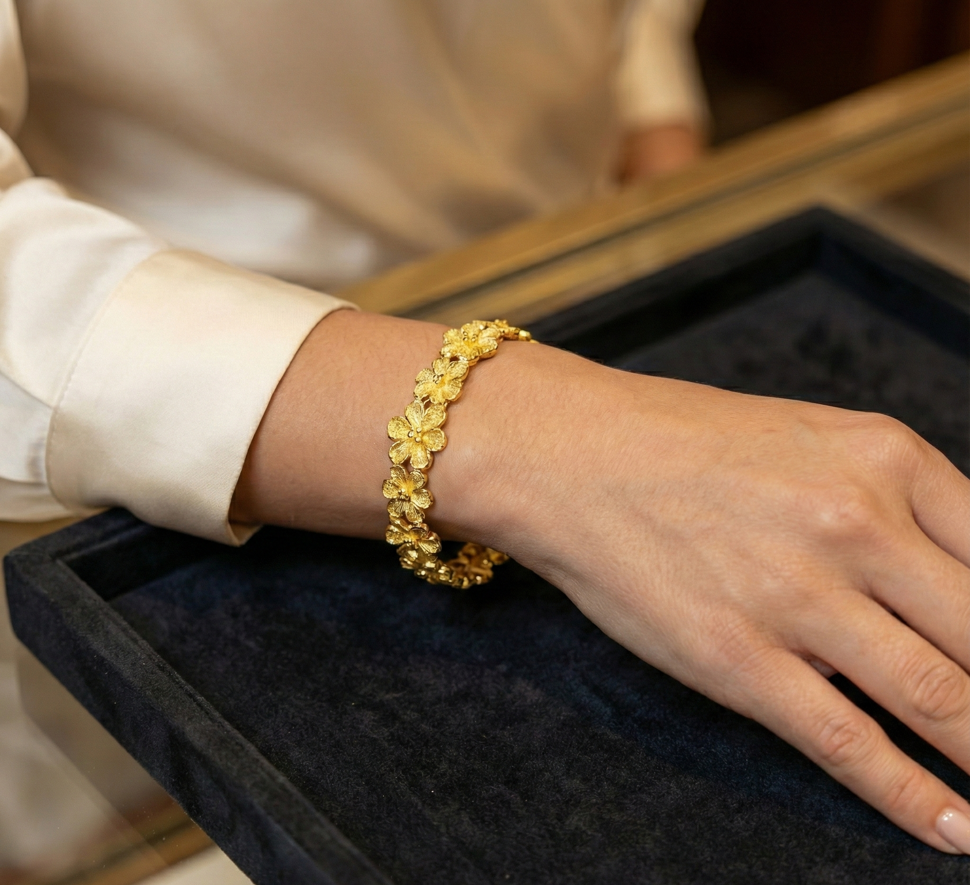 Es un brazalete de estructura rígida pero articulada. Cuenta con una bisagra discreta en un lateral y un cierre de seguridad integrado en el otro, lo que facilita su colocación y garantiza que permanezca seguro en la muñeca.